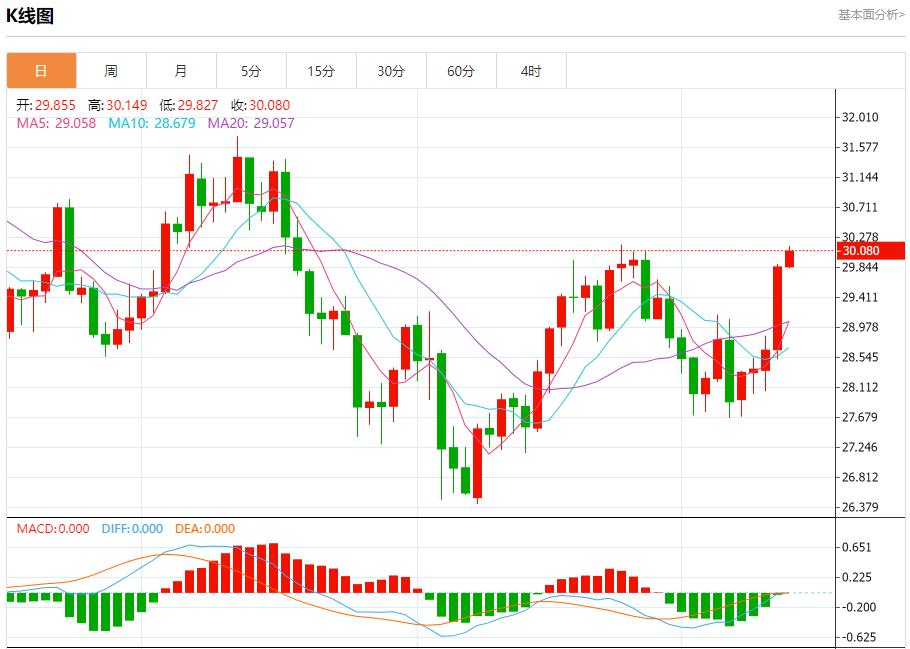 现货白银:截止北京时间20:19,现货白银上涨,现报30.071,涨幅0.73%。纽市盘前,白银价格试图突破30.06美元的水平,加强了对今天剩余时间继续看涨趋势的预期,提醒您我们正在等待访问31.00美元作为下一个主要目标,注意到如果不能在30.06美元上方巩固将使价格在明确确定下一个目标之前处于目标29.30美元区域的负面压力下。