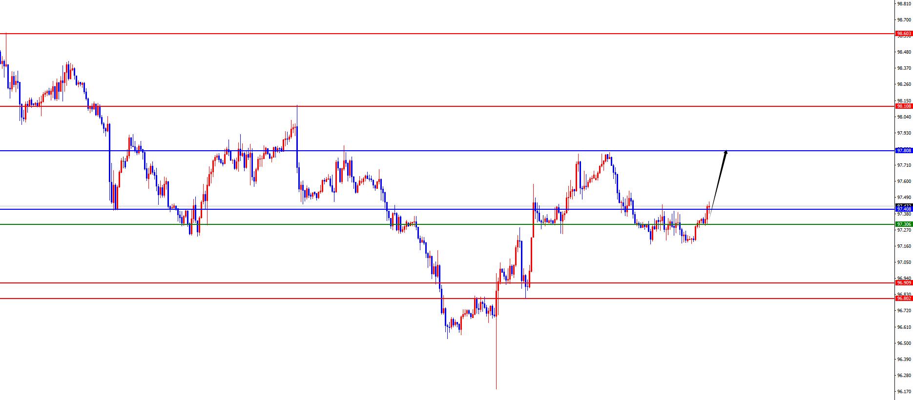 美指97.30-40区间多,防守5美金,目标97.60-97.80