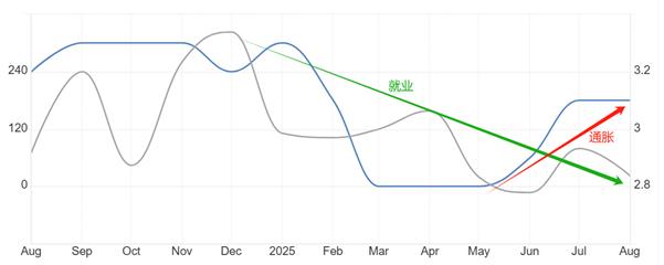 鲍威尔的意思很明确:美联储面临两难的局面,降息可能导致高通胀,不降息可能导致失业潮。上图是美国核心CPI年率与新增非农就业人口数据的叠加图,可以看出,通胀仍在回升,而非农就业人口持续下降。核心通胀率最新值为3.1%,仍高于2%的温和通胀标准。新增非农就业人口已经骤降至2.2万人,远远低于去年峰值32.3万人。虽然9月美联储重启降息,但是,未来数月通胀率若显著走高,今年11月和12月可能无法继续降息。
