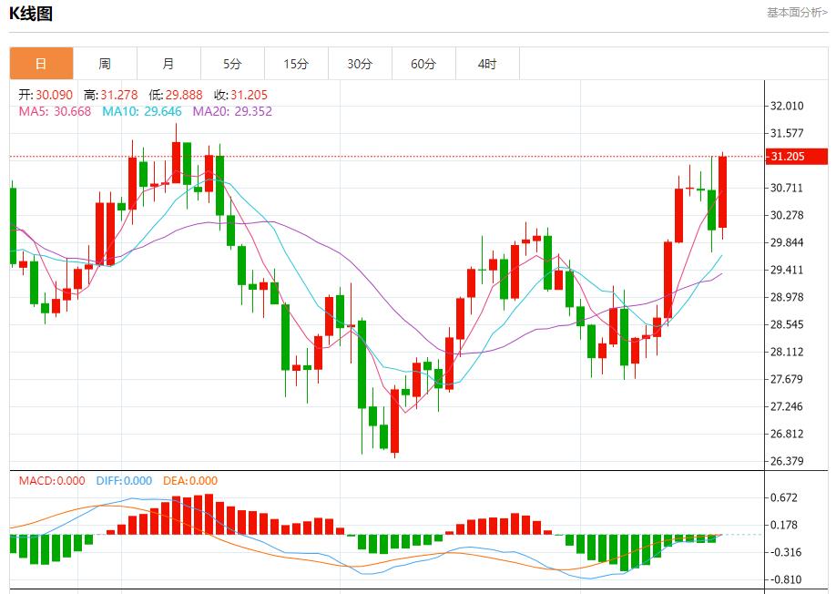 现货白银:截止北京时间20:21,现货白银上涨,现报31.211,涨幅3.86%。纽市盘前,白银价格成功实现了我们在31.00美元的第一个积极目标,并试图突破这一目标,加强了在日内和短期基础上继续看涨趋势的机会,以接近31.70美元作为下一个主要目标。