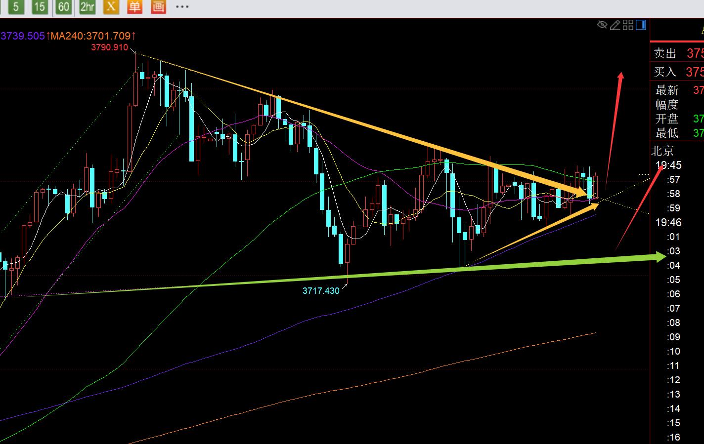 第二,黄金4小时级别:此周期从当前发展来看,多次承压中轨,今晚就是考验它得失的时候;只要22点收报不错的阳K,收盘站上中轨3754,则基本会延续强攻去刷历史新高;