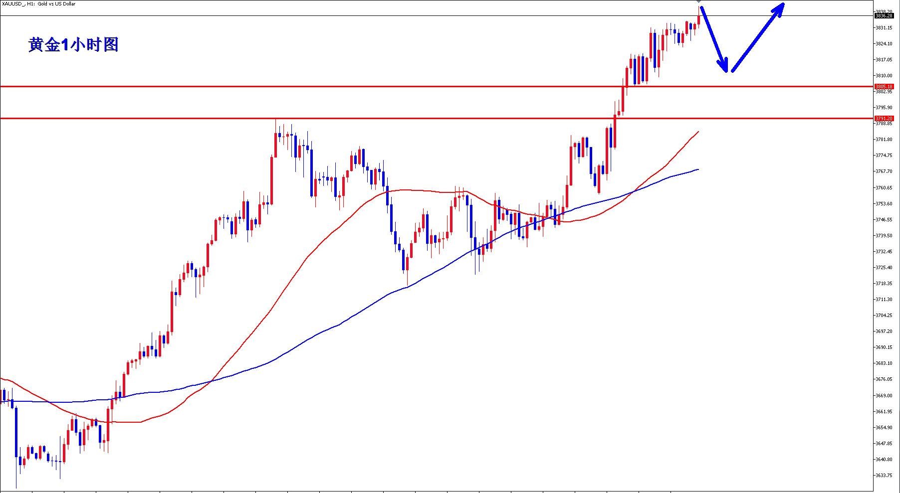 黄金1小时均线还是继续金叉向上的多头排列,黄金上涨还有动能。黄金昨日企稳3800一线之后,黄金再次回落也仅仅是回踩3805一线之后就继续上涨,今天回落3805上继续逢低做多。