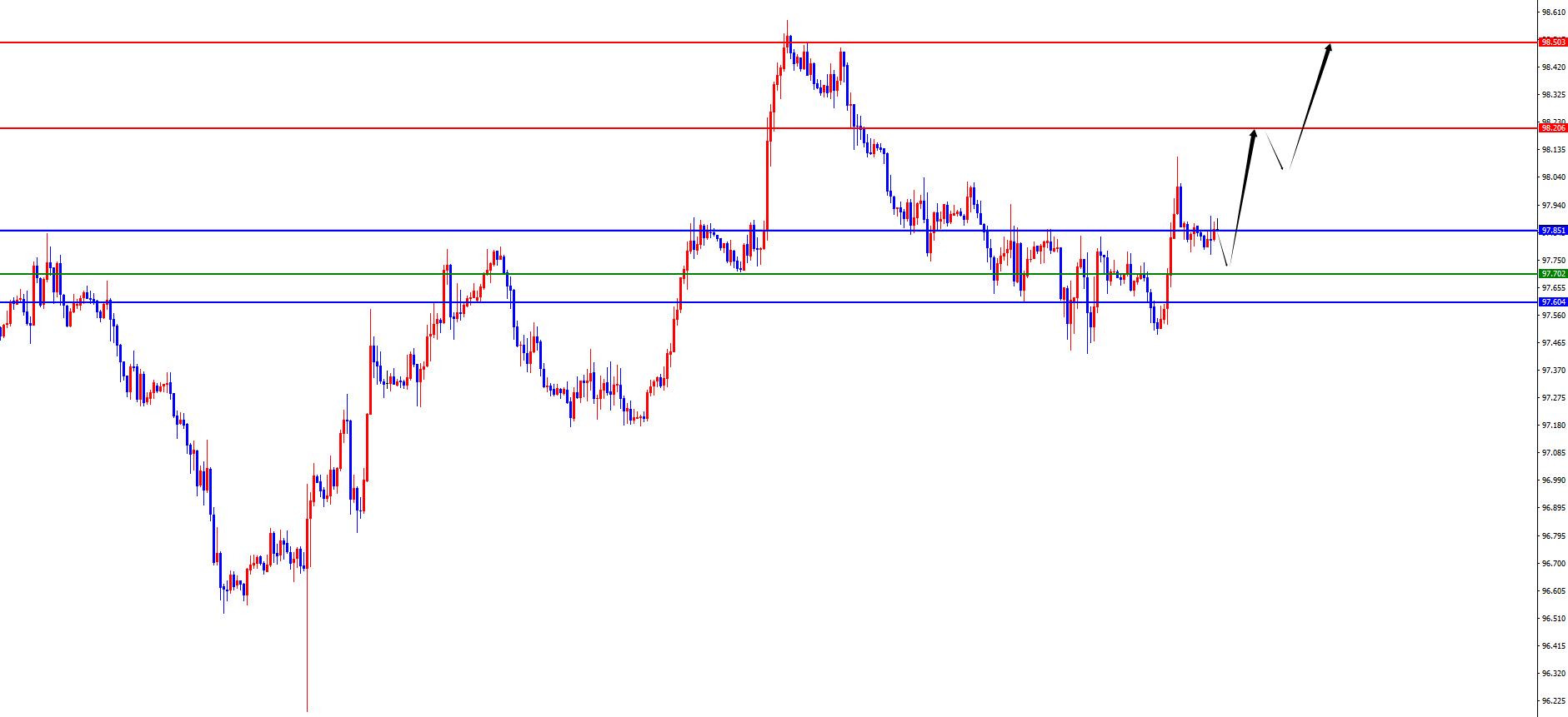 从多周期分析,周线级别来看近期价格在周线关键上下盘整,目前周线支撑于97.85区域,同时在上周价格站上周线阻力,后续看中期看多头延续。从日线级别看,随着时间的推移目前日线支撑于97.60区域,价格此位置之上波段进一步上涨。从四小时上看,昨日美盘向上突破四小时阻力位置,则前期阻力变支撑,目前重点关注97.70位置,价格在此位置之上短期多头对待。一小时上目前短线调整,待价格回踩至四小时支撑区域后继续关注上扬,上方关注98.20-98.50区域,一旦突破98.50则多头将持续延续。