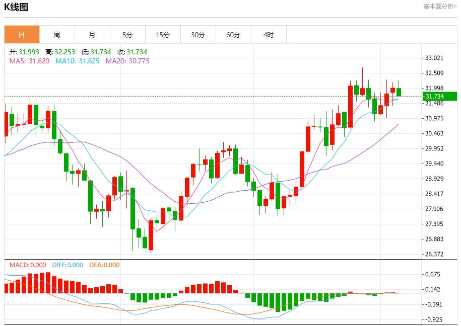 现货白银:截止北京时间20:22,现货白银下跌,现报31.737,跌幅0.83%。纽市盘前,白银价格受到随机利空的影响,显示出轻微的看跌倾向,而只要31.70美元水平保持不变,看涨趋势今天仍然有效,受到EMA50的支持,提醒您我们等待的目标从32.50美元开始,并在突破前一水平后延伸至33.00美元。