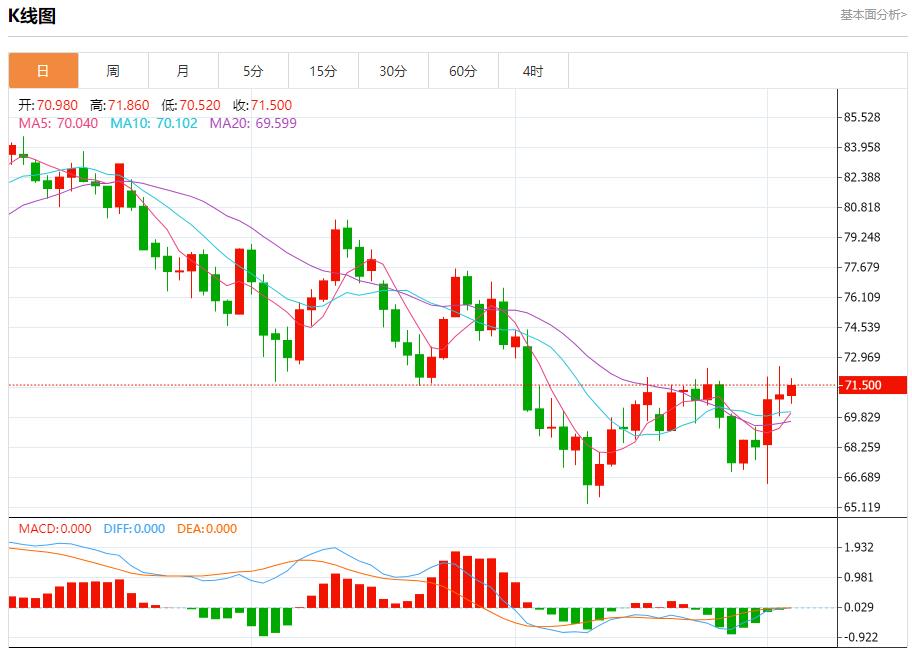 原油市场:截止北京时间20:22,美油上涨,现报71.490,涨幅1.98%。纽市盘前,原油价格正在测试71.95美元水平,等待突破这一水平,以确认牛市的延续,并实现新的目标,达到73.48美元。