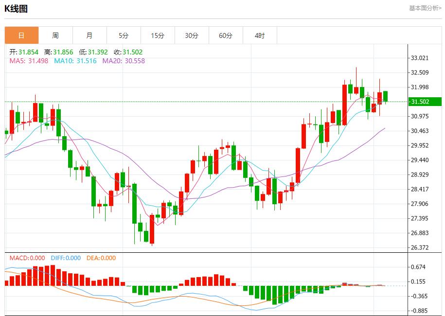 现货白银:截止北京时间20:22,现货白银下跌,现报31.503,跌幅0.97%。纽市盘前,白银价格继续在31.00美元支撑位和31.70美元阻力位之间波动,因此,我们保持中立,等待突破上述水平之一,以明确检测下一个目标。