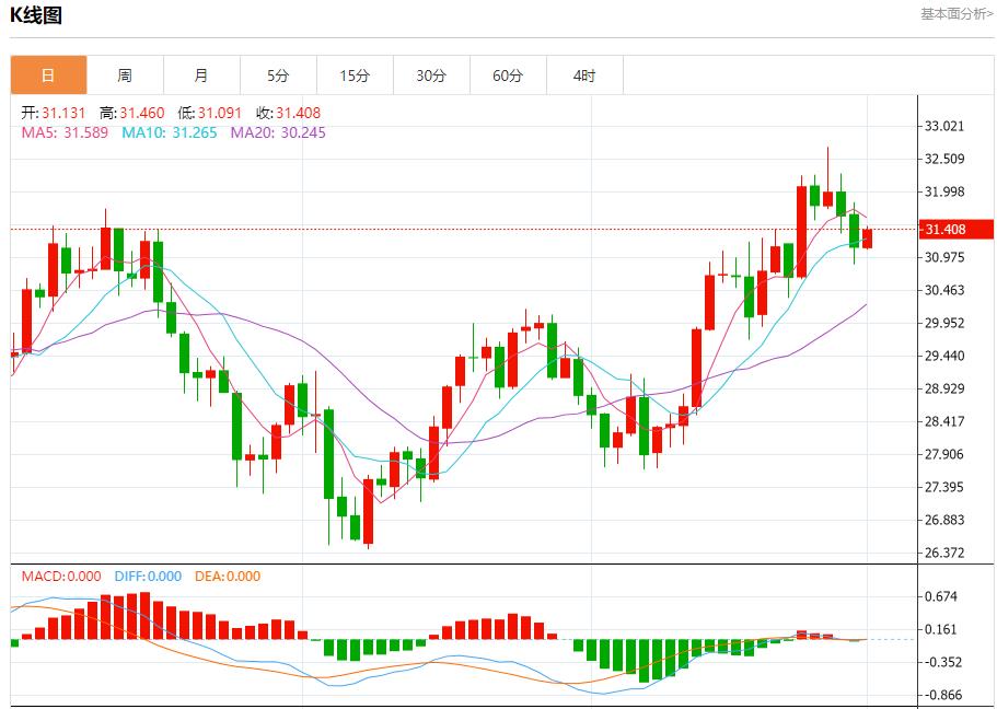 现货白银:截止北京时间20:20,现货白银上涨,现报31.413,涨幅0.88%。纽市盘前,白银价格在EMA50附近波动,仍然卡在31.00美元支撑和31.70美元阻力所代表的趋势关键之间,正如我们今天早上提到的,价格需要超过其中一个水平才能清楚地检测到它的下一个目的地,这使我们继续保持中立直到现在。