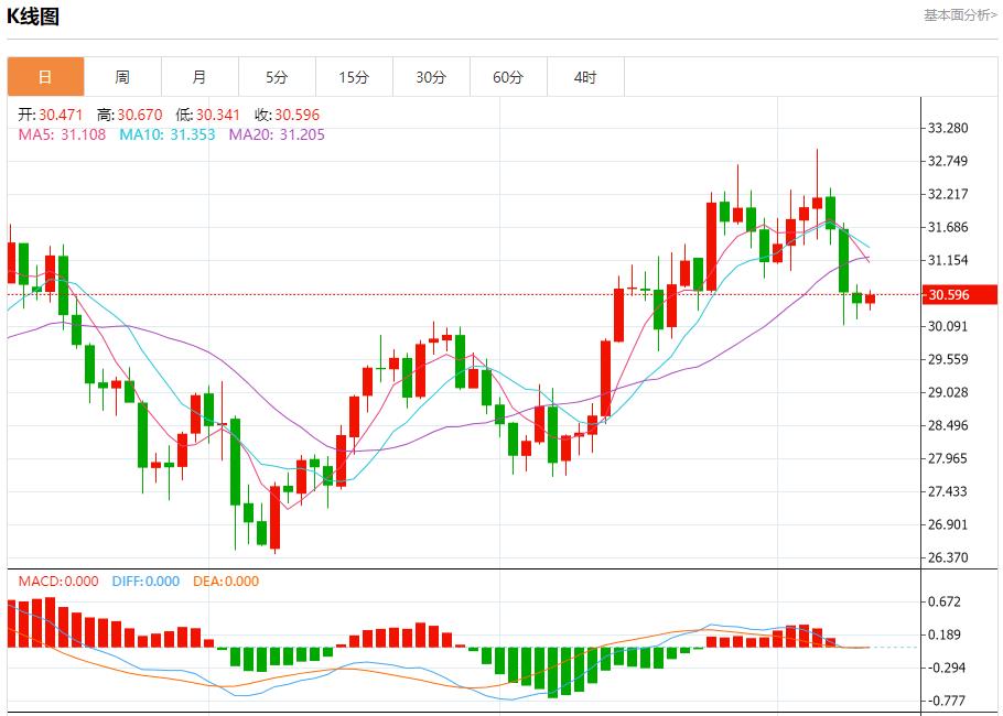 现货白银:截止北京时间20:20,现货白银上涨,现报30.595,涨幅0.39%。纽市盘前,自上午以来,白银价格没有表现出任何强劲的走势,继续在30.50美元附近波动,因此,今天的预期熊市趋势没有改变,这取决于价格稳定在31.00美元以下,提醒您我们的目标是从突破30.06美元开始,以确认走向29.30美元作为下一个主站。