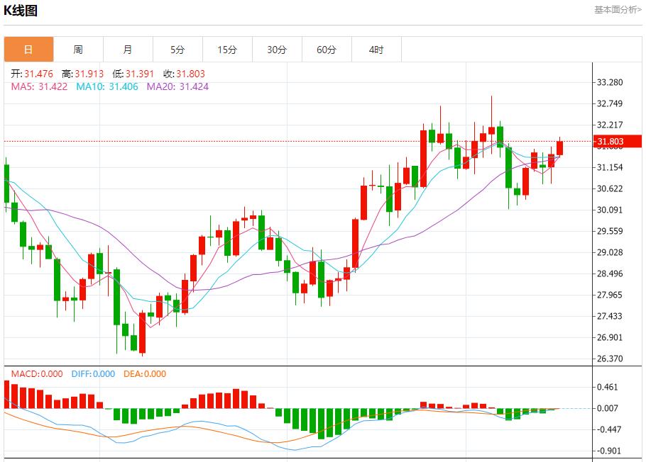 现货白银:截止北京时间20:23,现货白银上涨,现报31.793,涨幅0.99%。纽市盘前,白银价格超过31.70美元水平,以确认牛市趋势在今天剩余时间内的延续,提醒您我们的下一个目标位于32.50美元,在即将到来的交易中继续暗示牛市趋势,并在EMA50上方移动,提醒您牛市趋势的延续需要持有31.00美元以上。
