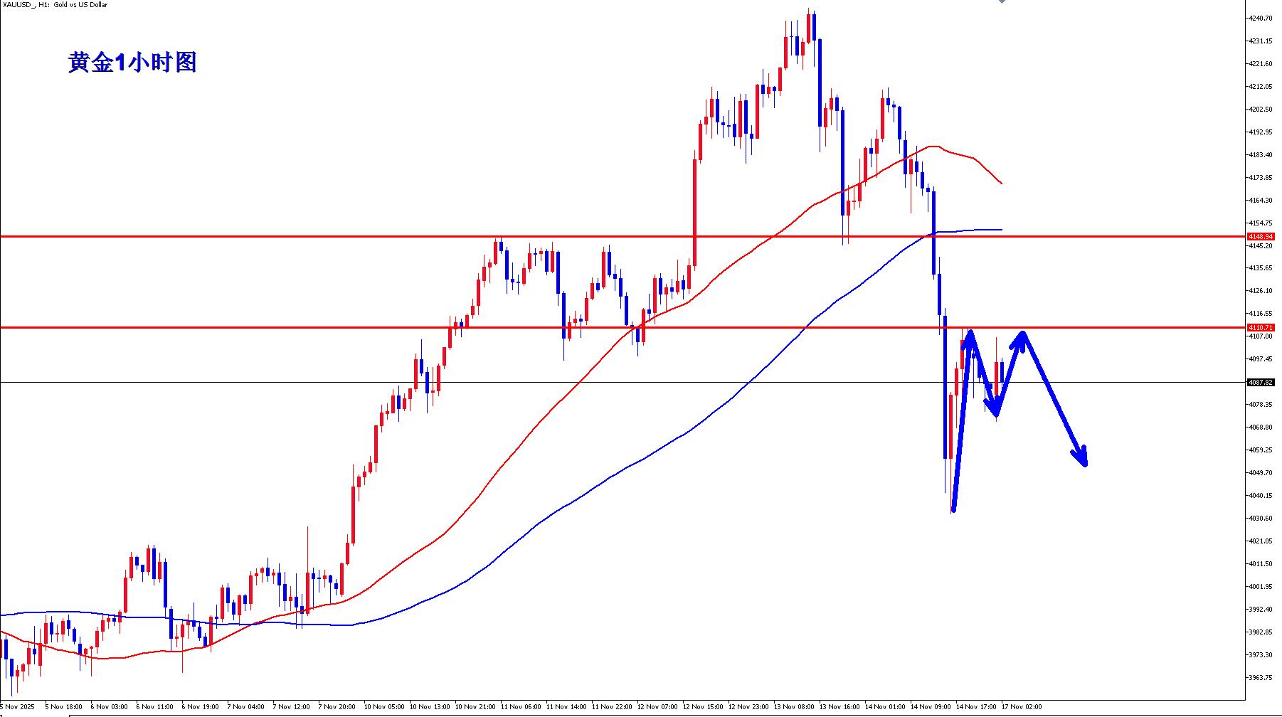 那么接下来说说今天的黄金,黄金早盘开盘之后小幅反弹不过继续高位承压再次回落,黄金短线来说4110一线已经形成了有效压制,黄金如果早盘反弹依然承压4110,那么黄金反弹就是属于极弱行情,那么下面可能还有一定的调整空间,不过即使黄金反弹稍微强势,黄金在4150下承压都还是1小时头肩顶结构,所以今天依然反弹高空为主。