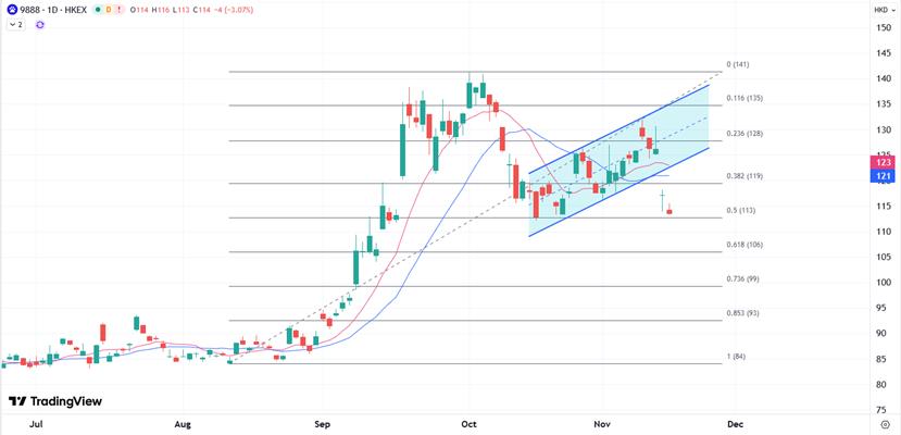 百度绩前的股价仍偏向相对低位的整理,跟随近日科技股的承压势头,如果业绩带来利好,则关注是否重返均线上方指向124至132港元目标位。但如果业绩加速其下行压力,则关注会否进一步测试108至100港元的支撑。