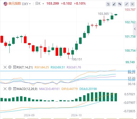周一,美元指数触及10周高点,延续了其长达数周的看涨走势,截至目前,美元报价103.29。