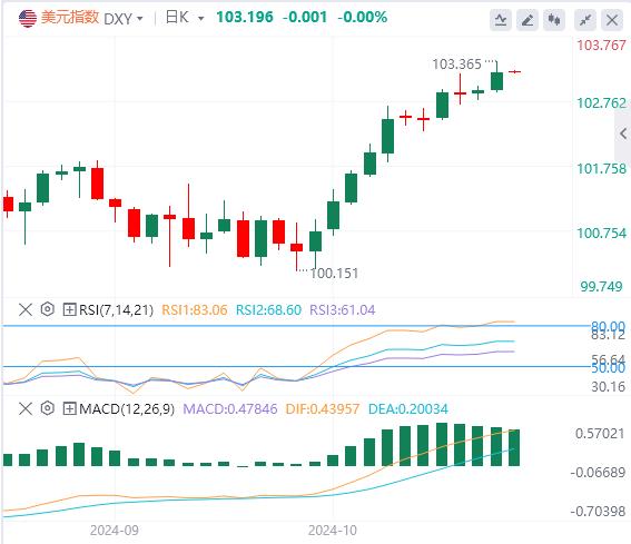 10月15日,北京时间周二亚市早盘,美元指数徘徊在103.19附近。周一,因数据显示美国经济仅温和放缓,符合美联储适度降息的押注,美元指数触及10周高点,延续了其长达数周的看涨走势,最终收涨0.28%,报103.20。基准的10年期美债收益率收报4.1050%;对货币政策更敏感的两年期美债收益率收报3.9660%。因美元指数持续走强的影响,现货黄金延续回调,最终收跌0.31%,报2648.68美元/盎司。现货白银最终收跌1.09%,报31.18美元/盎司。由于以色列总理内塔尼亚胡向美国表示,以色列将打击伊朗的军事目标,而非核设施或石油目标,国际油价暴跌逾4%。WTI原油最终收跌4.65%,报71.94美元/桶;布伦特原油收跌4.81%,报75.05美元/桶。
