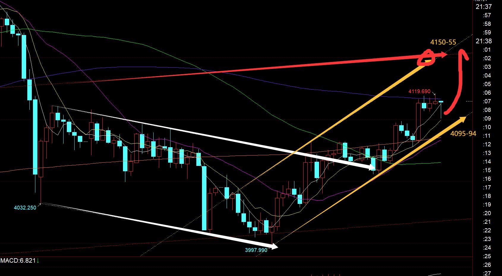 第三,黄金小时线级别:从上图通道分布看,隔夜收盘前已经突破站上了白色通道上轨,弱势格局也就结束,今日早间回踩确认上轨支撑大概是4060一线,而它也做了一次小刺穿假象,最低4055.5,稳住拉升后,就一路震荡上攻,每次出大阳,紧接着就是震荡回踩,再企稳继续出大阳;可以发现,每次回踩的低点都是前一波拉升的618分割处,4060、4078都是,所以它们都是看涨点,技术上也走的比较规范;欧盘拉升破高,今晚还有二次上涨,最后一波回踩618分割位置是4095-94,刚好也可以对应黄色通道下轨,触及继续看涨(当然,也可能回踩不到,那样只能说明它反弹力度加强了),阻力先留意4120-21,其次是4150,这两个位置是4244-3997的50和618分割点,尤其重点关注4150,也是前期红色通道上轨,首次触及应该有些承压回落,毕竟是震荡期;但二次试探,三次试探去突破的话,就有望指向日线收敛三角上轨,接近4200-4190范围;