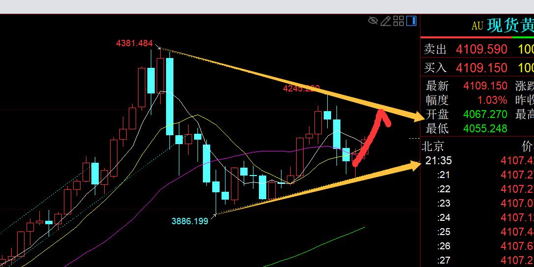 第一,黄金日线级别:昨日收报一根不错的探底反阳K,低点也守住了图中小收敛三角下轨,那么后续几日就朝着上轨去试探(这里自己去对应,因为随着时间延续,它是变量),或至少会试探4245-3997这几日下跌的618分割处,大概4150一线;