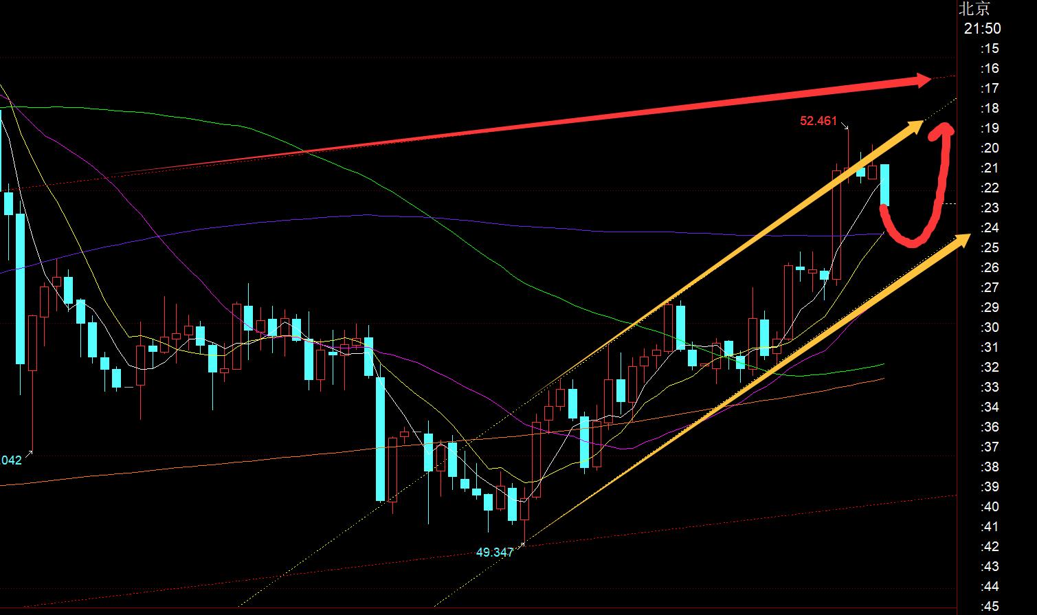 白银方面:首先,日线级别,它还是倾向于有些标准的上升五浪,第一浪的高点49.35稍微刺破了一丢丢,但不影响整体的发力效果;按照第五浪拉升推算高度,是可以指向54.8一线,也就是把前高54.45给击穿下再冲高回落,进行高位宽幅整理;而白银今年整体会强于黄金,所以你可能会发现黄金回调偏弱,白银依然处于偏强阶段;从上图小时线看,也是围绕黄色上行通道,下轨支撑对应51.4一线,也会是中轨上移处,稳住这里则也会有二次拉高,阻力目标关注52.5(54.38-49.34的618),而震荡中618出现压制很正常,所以你会发现白银就是提前于黄金所表现的,黄金可以参考白银;那么若突破52.5,上方还有一处红色上轨52.8-53,这里突破站上的话,日线基本会冲前高;