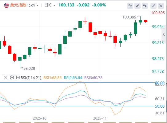 周四,由于喜忧参半的非农就业数据未打消市场对美联储12月降息的质疑,美元指数维持在100关口上方高位震荡,盘中触及6个月高位,截至目前,美元报价100.13。