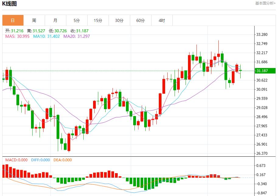 现货白银:截止北京时间20:26,现货白银下跌,现报31.182,跌幅1.08%。纽市盘前,白银价格在今天开盘时面临着测试31.00美元水平的负面压力,注意到价格保持稳定并再次开始上涨,以保持牛市趋势在即将到来的时期有效和活跃,目标是31.70美元,其次是32.50美元水平,作为下一个主要站。