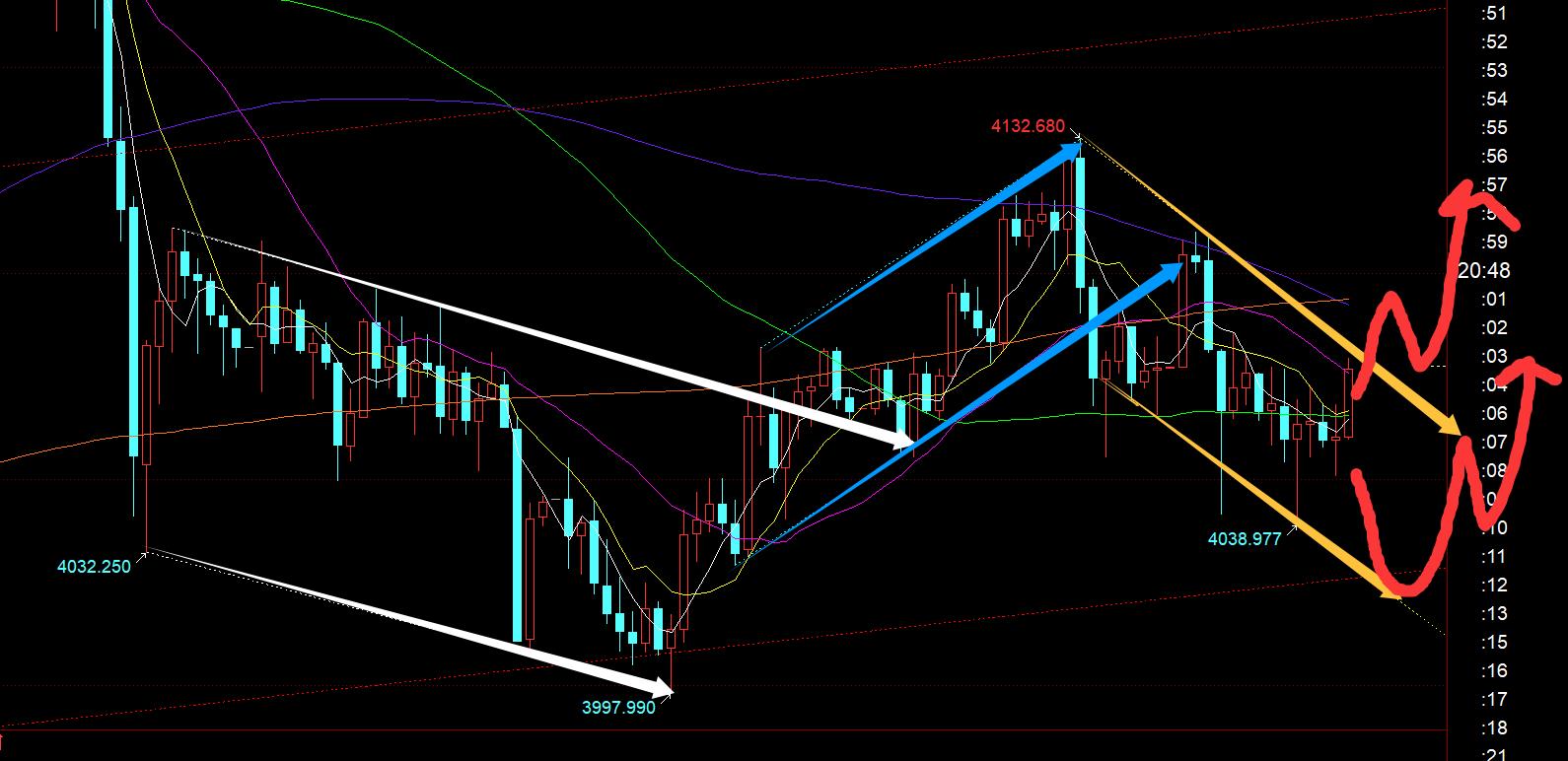 第三,黄金小时线级别:从上图通道分布看,目前是处于蓝色通道下轨之下,黄色通道上轨承压,高点在逐步走低,震荡偏弱些;但同时每一次刷前面新低,都会出现较长下影K,说明下方支撑也逐步强劲,macd已经完成空头释放,随时等待零轴之下金叉而多头放量,因此今晚倾向于震荡拉升,要么探底拉升,要么直接拉升,就决定于今晚公布的9月非农数据;趋势线压力点集中4083-4085,若能大阳或连阳突破站上,那么会继续冲击4110,甚至4132、4150-4160等;反之,无法突破站上趋势压力点,则反复冲高回落,下方再破日内低点,依然容易超跌反弹;其实从15分钟级别,4055-4041-4039三次打出的低点,对应macd空头柱能是逐步衰减的,形成量能背离,就容易超跌反弹,当前这个小时就有所启动了,回踩4052企稳拉升反弹中;因此,今晚数据若利好,则突破站上4085站稳后,则回踩确认继续看涨上行;反之,出现急跌回落,则等破了今天低点之后,等企稳,大概4030及下方仍随时会超跌反弹;