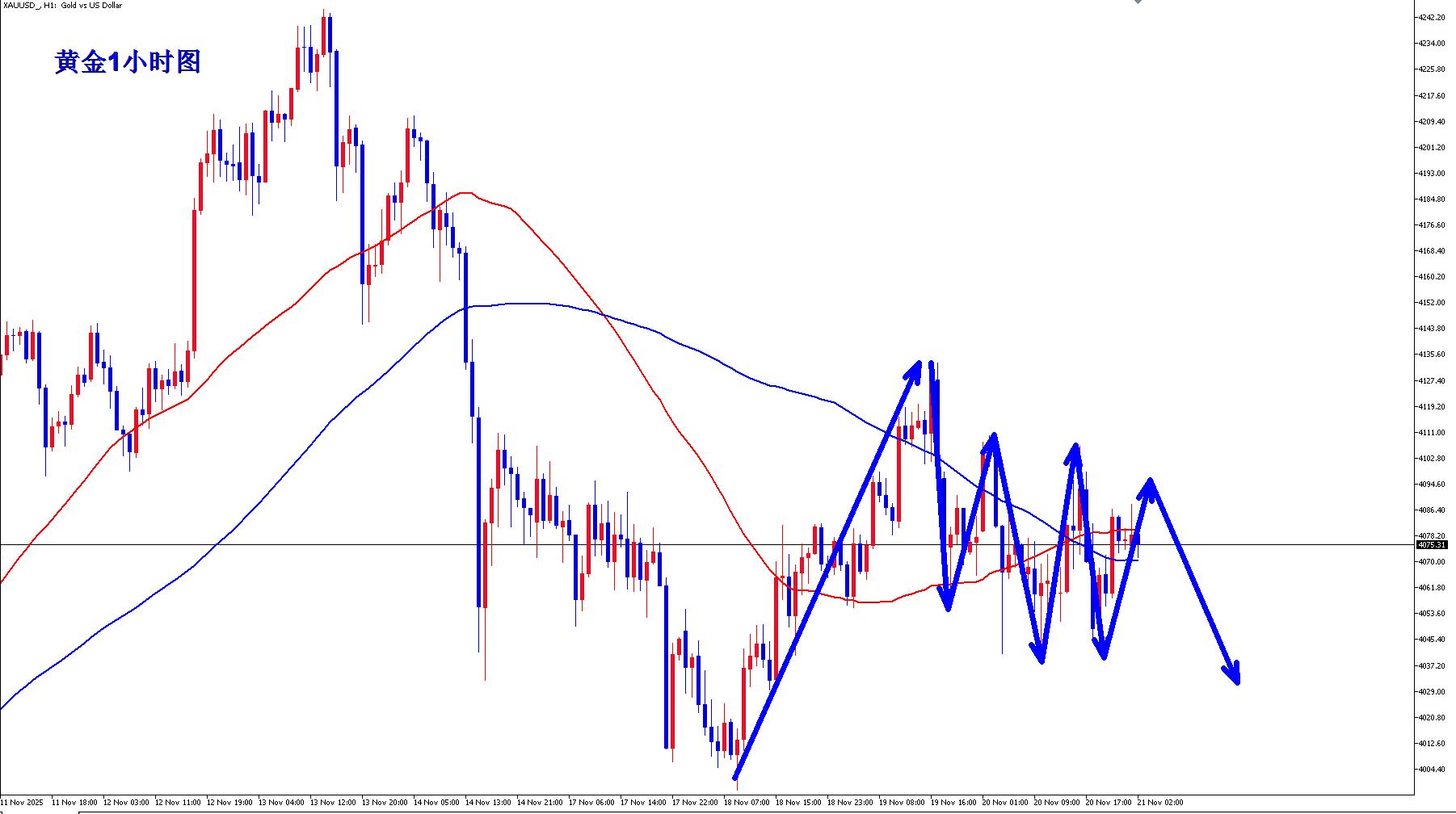 黄金1小时现在整体是在下行通道中偏空震荡,黄金现在整体还是重心下移的走势,黄金昨晚强势反弹也并未触及4110一线,黄金4110一线压制依然还是很明显,黄金反弹高点依次降低,那么说明黄金更加偏弱势一点,黄金早盘反弹承压4110一线还是继续逢高空。