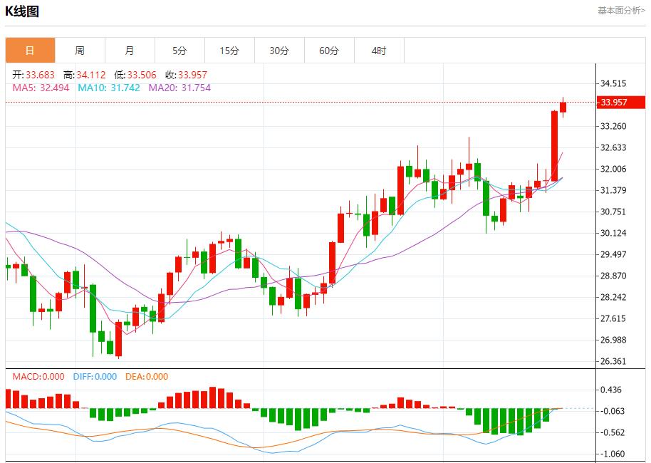 现货白银:截止北京时间20:23,现货白银上涨,现报33.967,涨幅0.78%。纽市盘前,银价试图突破34.00美元关口,以支撑日内和短期预期的看涨趋势,目标是34.55美元作为下一站。