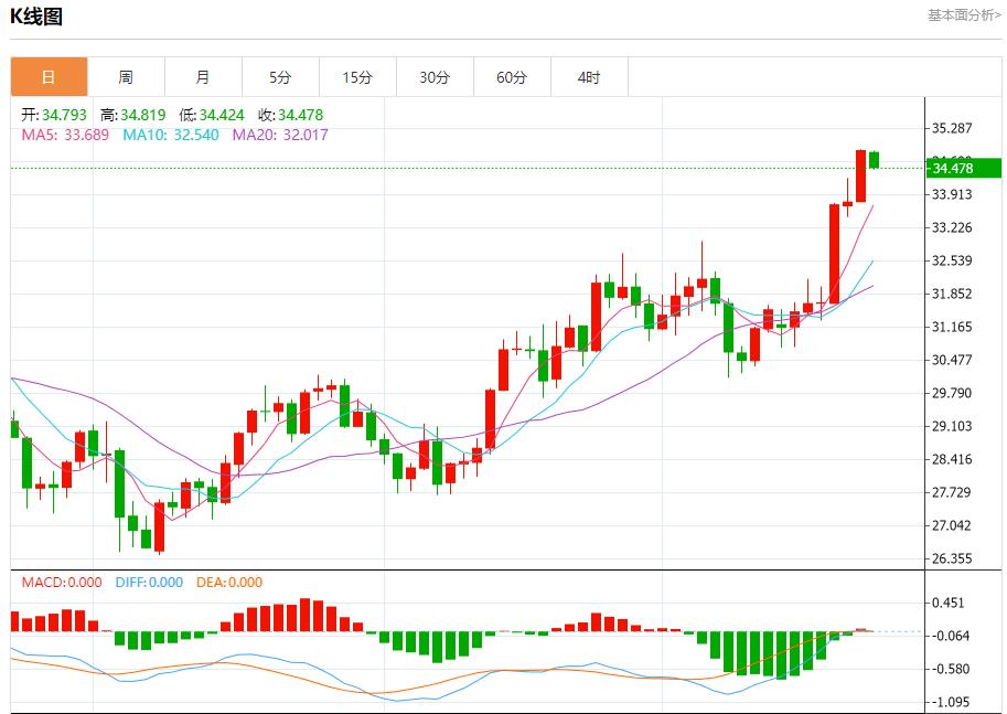 现货白银:截止北京时间20:23,现货白银下跌,现报34.481,跌幅1.02%。纽市盘前,白银价格正在测试看涨通道的阻力线,只要34.25美元水平保持不变,看涨趋势今天仍然有效,受到EMA50的支撑,提醒您我们正在等待访问35.00美元,随后是35.55美元,作为下一个主要目标。