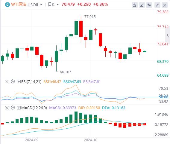 周五亚盘,原油交投70.47附近。有报道称美国和以色列将尝试重启有关加沙停火的谈判,国际原油期货价格在波动中走低,美油一度跌破每桶70美元关口。能源咨询公司RitterbuschandAssociates的分析师在一份报告中表示,“由于中东风险溢价几乎每天都在扩大和收缩,能源综合体继续曲折波动。”
