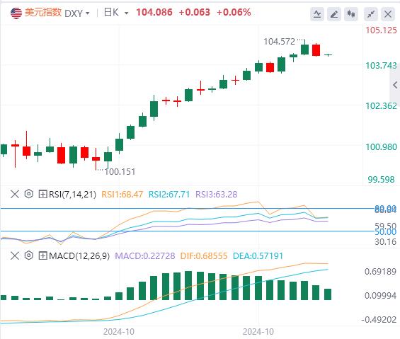 10月25日,北京时间周五亚市早盘,美元指数徘徊在104.08附近。周四,美元指数有所回调,并跌至104关口附近,最终收跌0.38%,报104.02。美债收益率同样回落,基准的10年期美债收益率收报4.2170%;对货币政策更敏感的两年期美债收益率收报4.0920%。现货黄金一度涨超1%,但在2740关口附近受阻回落,最终收涨0.75%,报2735.77美元/盎司。现货白银在美盘时段大幅下挫,抹去日内全部涨幅并转跌,最终收跌0.07%,报33.66美元/盎司。据报美国和以色列将试图重启加沙停火磋商,原油下跌近1%,WTI原油在美盘前一度涨至72.20美元的日内高点,随后回吐全部涨幅并转跌,最终收跌0.99%,报70.22美元/桶;布伦特原油收跌0.91%,报74.22美元/桶。