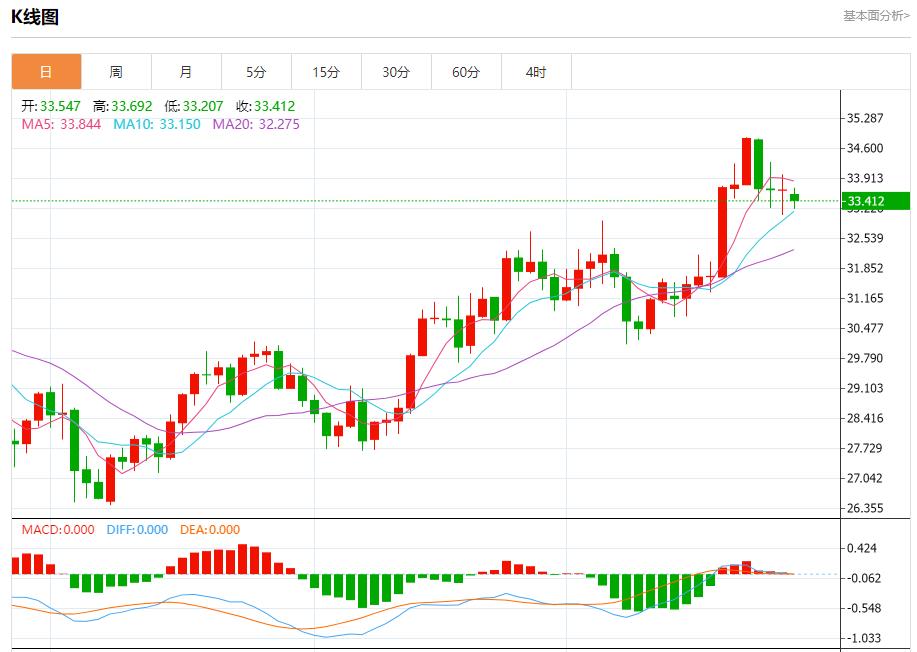 现货白银:截止北京时间20:23,现货白银下跌,现报33.409,跌幅0.71%。纽市盘前,白银价格再次测试33.70美元水平,并从那里开始熊市反弹,以测试33.04美元为第一站,提醒您打破这一水平将延长熊市波达到32.50美元,而预期的下跌将保持有效,除非价格回升至突破33.70美元并保持在它上方。