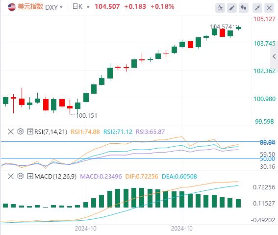 上周五,美元指数先跌后涨,在美盘时段收复日内全部失地,最终收涨0.35%,连续收涨四周,截至目前,美元报价104.50。