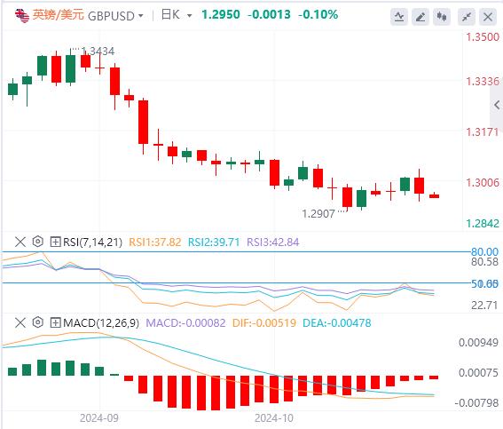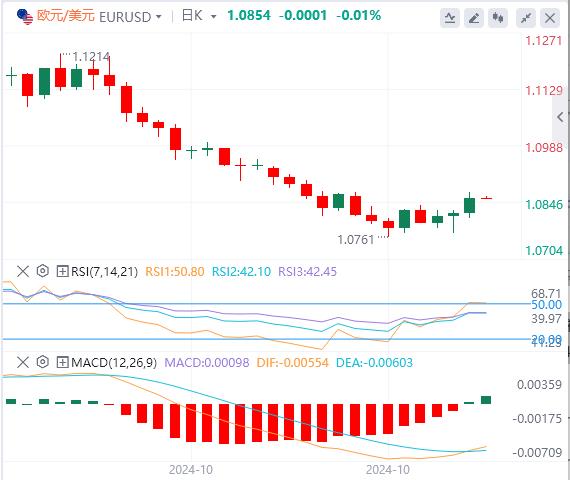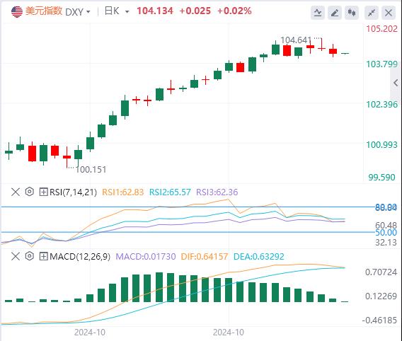 美元指数:截止发稿,美元指数徘徊在104.13附近。美国10月份ADP就业变化人数增加23.3万,超出预期,这可能限制美元的跌幅。9月份ADP就业变化数据被上调至增加15.9万,进一步支撑美元。美国第三季GDP增长2.8%,强于全球其他地区,但低于市场预期。期货市场目前几乎完全预期美联储下周将降息25个基点。技术面上,如果美元指数收于104.13的50MA下方,它将朝着最近的支撑位103.40–103.60区间前进。