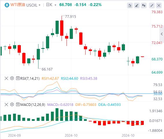 10月31日,北京时间周四亚市早盘,美元指数徘徊在104.13附近。周三,美元指数盘中呈“过山车”走势,其在美盘前一度涨至104.44的日内高点,但随后回吐日内全部涨幅并转跌,最终收跌0.17%,报104.09。美债收益率有所回升,基准的10年期美债收益率收报4.3%;对货币政策更敏感的两年期美债收益率收报4.174%。现货黄金续创历史新高,日内一度逼近2790美元关口,但未能站上此处,最终收涨0.43%,报2786.24美元/盎司。现货白银失守34美元关口,收跌1.97%,报33.77美元/盎司。因数据显示上周美国原油和汽油库存意外下降,且有报道称欧佩克+可能推迟石油增产计划,原油有所反弹。WTI原油日内涨超2%,并一度逼近69美元,最终收涨2.31%,报68.86美元/桶;布伦特原油收涨2.3%,报72.63美元/桶。