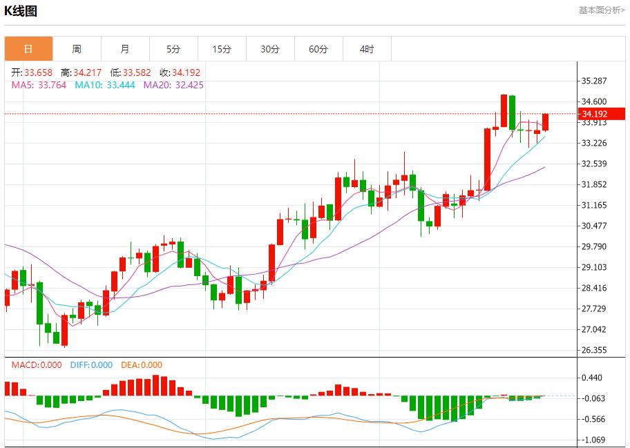 现货白银:截止北京时间20:23,现货白银上涨,现报34.188,涨幅1.58%。纽市盘前,白银价格稳定在33.70美元附近,我们仍然保持中立,直到我们获得更明确的信号,为下一个趋势,继续监测价格根据这一水平。