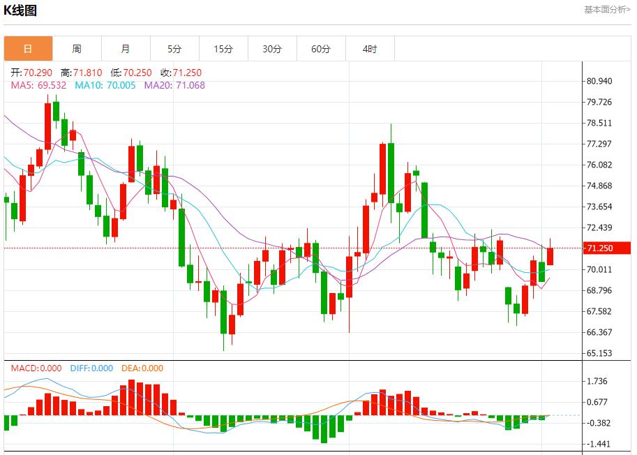 原油市场:截止北京时间21:23,美油上涨,现报71.230,涨幅2.52%。纽市盘前,原油价格恢复积极交易,接近我们等待的目标72.15美元,加强了今天剩余时间内继续看涨趋势的预期,等待突破这一水平,以确认积极情绪的持续,并实现额外收益达到73.70美元,提醒您牛市的持续取决于70.58美元以上的价格稳定。