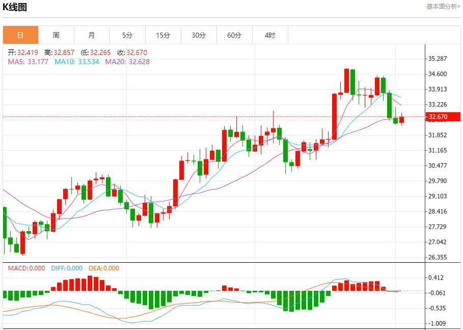 现货白银:截止北京时间21:23,现货白银上涨,现报32.659,涨幅0.84%。纽市盘前,白银价格现在下跌,测试32.50美元水平,等待突破这一水平,以确认向31.95美元反弹,随后是代表我们主要目标的31.25美元水平,注意突破33.04美元将停止熊市修正,推动价格再次上涨。
