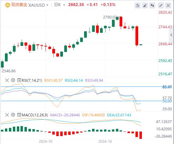 周四亚盘,黄金交投于2662.38附近。金价周三大跌逾80美元至三周低点,最低触及2652.35美元/盎司,收报2658.78美元/盎司,跌幅约3.1%,为6月7日以来最大单日跌幅,因投资者在共和党人特朗普当选美国总统后纷纷涌入美元,美债收益率也大幅上涨,美股刷新历史高点也打压黄金的避险买需。本交易日还将出炉美国初请失业金人数变动,投资者需要予以关注,此外,留意市场对特朗普胜选影响的进一步解读情况。重点关注北京时间周五凌晨3:00的美联储利率决议和03:30的美联储主席鲍威尔新闻发布会。