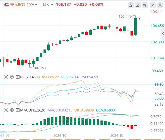 11月7日,北京时间周四亚市早盘,美元指数徘徊在105.18附近。周三,由于特朗普胜选后的移民、税收和贸易政策预计将刺激美国更高的增长和通胀,美元指数飙升至四个月新高,最终收涨1.686%,报105.16,创2020年3月以来最大单日涨幅。美债收益率全线上涨,基准的10年期美债收益率收报4.435%;对货币政策更敏感的两年期美债收益率收报4.266%。随着投资者在特朗普当选美国总统后涌入美元,现货黄金日内重挫近85美元至三周低点,最终收跌3.08%,报2659.56美元/盎司,创五个月来的最大单日跌幅。现货白银最终收跌4.56%,报31.17美元/盎司。国际原油V型反转,因投资者权衡强势美元与特朗普的外交政策计划可能挤压全球石油供应的可能性。WTI原油盘中一度跌破70关口,随后抹去部分跌幅,最终收跌0.22%,报71.56xm217.com美元/桶;布伦特原油收跌0.38%,报75.06美元/桶。