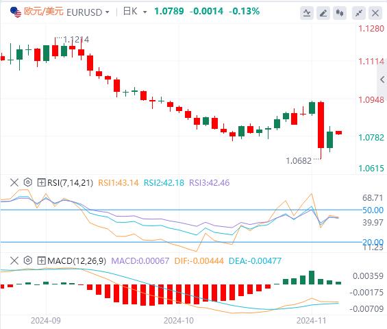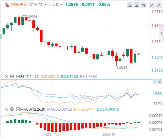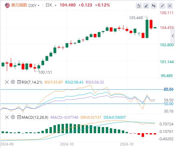 美元指数:截止发稿,美元指数徘徊在104.46附近,美联储承认经济前景的不确定性,但仍认为经济将稳步扩张。尽管降息,但美联储表示对实现2%的长期通胀目标充满信心。由于对通胀政策的预期和服务业数据强劲,美元指数本周在特朗普当选后飙升。在那次大幅飙升之后的获利回吐可能会推动美元走低。技术面上,如果美元指数收于104.21的50MA下方,它将向位于103.40–103.60区间的下一个支撑位移动。