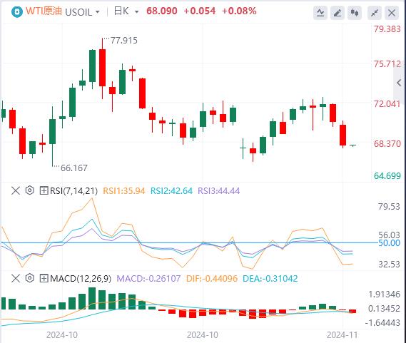 周二亚盘,原油交投68.09附近。由于担心特朗普政府将引发以关税为主导的贸易战,以及市场担忧中国需求增长,WTI油价震荡走低。唐纳德-特朗普赢得美国总统大选可能会持续影响WTI油价。特朗普已宣布打算对所有进口产品征收10%至20%不等的一揽子关税,并对从中国进口的多达60%的产品征收额外关税。与中国重启贸易战也很可能会伤及中国的经济增长,推迟原油需求的复苏。中国政府上周五公布的最新经济刺激计划低于市场预期。此外,上周末发布的经济数据显示,10月份中国消费者价格增速为四个月来最放放缓,同时生产者价格通货紧缩加深,引发了市场对全球第二大石油消费国需求增长的担忧。