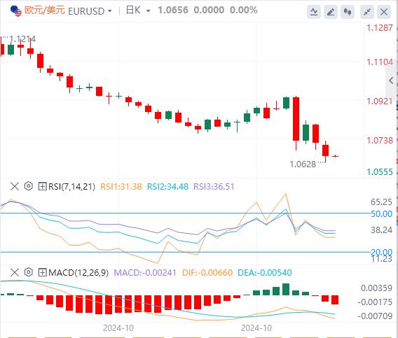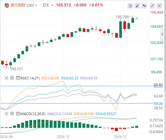 11月12日,北京时间周二亚市早盘,美元指数徘徊在10551附近。周一,美元指数再创四个月新高,盘中最高触及105.709,最终收涨0.524%,报105.5。美国https://xm217.com债市因退伍军人节休市一日。在美元持续反弹和投资者继续获利了结的压力下,现货黄金日内重挫65美元,一度逼近2610美元关口,最终收跌2.39%,报2619.53美元/盎司。现货白银最终收跌1.91%,报30.69美元/盎司。鉴于黎以停火的希望和强美元的施压,国际原油继续回调。WTI原油最终收跌3.12%,报68.04美元/桶;布伦特原油收跌2.72%,报71.83美元/桶。美国天然气期货日内暴涨9%;路易斯安那州亨利中心基准天然气现货价格暴跌至25年来的最低点。