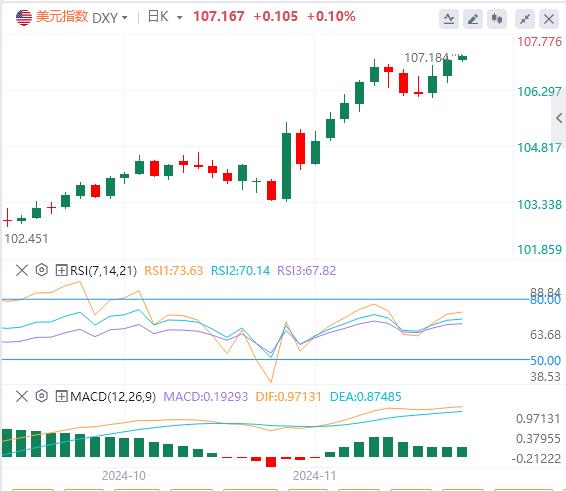 周四,因市场预期美联储明年降息次数将减少,美元指数延续昨日涨势,截至目前,美元报价107.16。