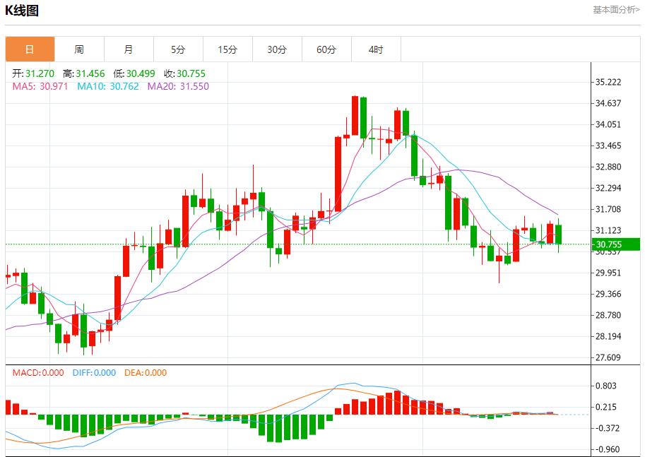 现货白银:截止北京时间21:15,现货白银下跌,现报30.77,跌幅1.70%。纽市盘前,白银价格提供了额外的负面交易来测试关键支撑30.63美元,注意到价格仍在该水平上方盘整,以保持我们的看涨观点,这取决于上述水平上方的价格稳定性,提醒您我们的第一个目标位于31.63美元,注意到随机指标明显获得积极势头,以加强恢复今天预期上涨的机会。