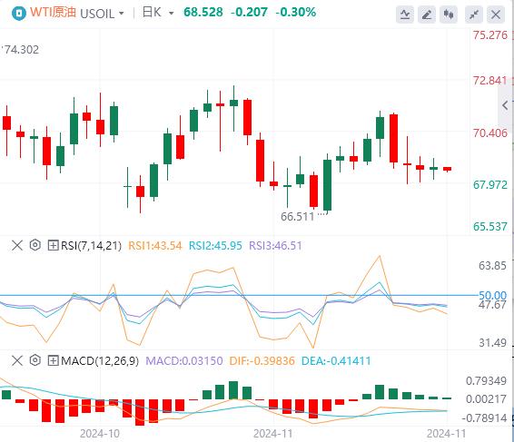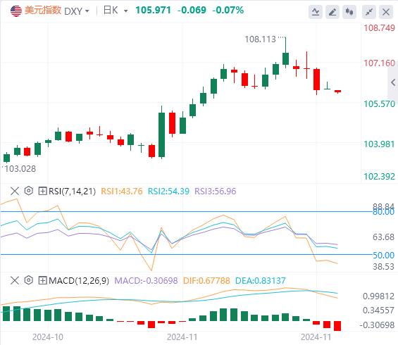 11月29日,北京时间周五亚市早盘,美元指数徘徊在105.97附近。周四,因积极的市场情绪和相对于其他发达国家更高的利率,美元小幅走高,美元指数最终收涨0.14%,报106.17。受美国感恩节假期影响,美国股市和债市11月28日休市一日。由于地缘政治的不确定性和贸易战的担忧提振了避险需求,现货黄金三连阳,最终收涨0.07%,报2637.74美元/盎司。现货白银最终收涨0.42%,报30.20美元/盎司。因以色列和真主党相互指责对方违反停火协议,以色列坦克向黎巴嫩南部开火,WTI原油最终收涨0.20%,报68.86美元/桶;布伦特原油收涨0.46%,报72.65美元/桶。