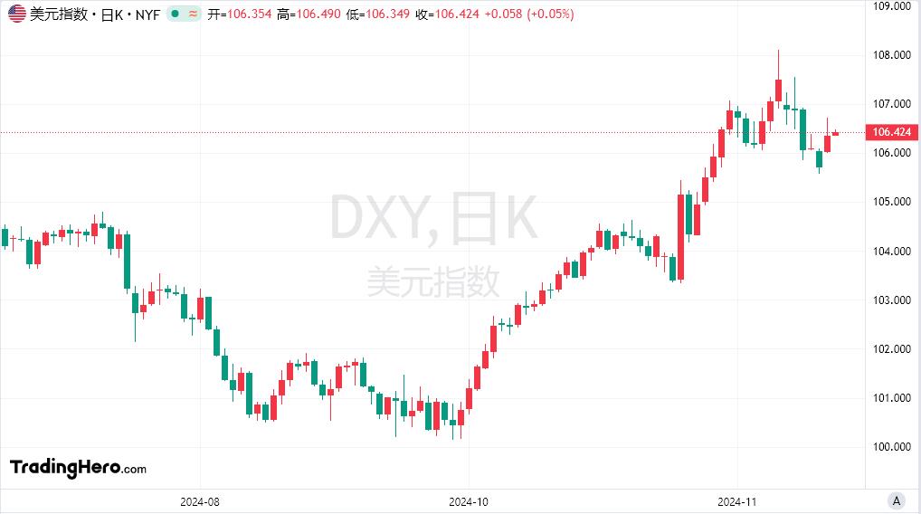 12月3日,北京时间周二亚市早盘,美元指数徘徊在106.442附近。周一,美元指数开盘上涨,收复106关口,盘中一度涨至106.72的日内高点,最终收涨0.3%,报106.38。美债收益率先涨后跌,两年期美债收益率收报4.192%,10年期美债收益率收报4.198%。因美元大幅反弹,现货黄金周一有所下跌,其在美盘一度冲上2650美元关口上方,而后回吐大部分涨幅,最终收跌0.45%,终结了连续4日小幅收涨的势头,报2638.57美元/盎司。现货白银最终收跌0.33%,报30.50美元/盎司。原油周一持稳。WTI原油盘中一度逼近69美元,随后迅速回吐日内所有涨幅并转跌,最终价格与上周五收盘持平,报68美元/桶;布伦特原油收跌0.24%,报71.83美元/桶。