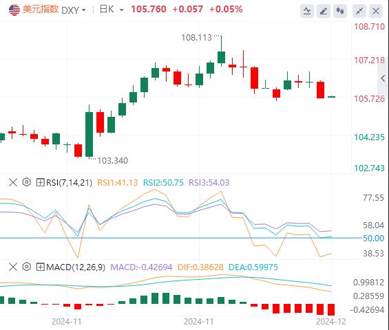 12月6日,北京时间周五亚市早盘,美元指数徘徊在105.76附近周四,美元指数有所下行,并失守106关口,最终收跌0.59%,报105.69。美债收益率涨跌不一,两年期美债收益率小幅回升,收报4.150%,10年期美债收益率收报4.175%。现货黄金盘中多次上探2650美元关口,但在美盘前急速下挫,较日内高点一度大跌30美元,最终收跌0.68%,报2631.79美元/盎司。现货白银最终收涨0.1%,报31.32美元/盎司。由于投资者权衡了明年供应充足的前景与欧佩克+将增产计划推迟三个月至2025年4月的影响,原油小幅下跌,WTI原油在68美元附近来回震荡,最终收跌0.44%,报68.15美元/桶;布伦特原油收跌0.4%,报71.98美元/桶。