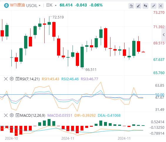 周四亚盘,原油交投68.41附近。原油期货价格下跌,交易员正密切关注即将到来的OPEC会议决议。尽管上周美国原油库存降幅超过预期,这对油价形成了一定支撑,但市场情绪仍显谨慎。