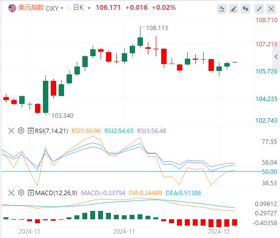 美元指数:截止发稿,美元指数徘徊在105.18附近。美元指数周一开盘小幅下跌,维持在105.80附近的位置。市场参与者将注意力转向将于周三公布的11月消费者价格指数(CPI)数据,预计该数据将显示年度总体通胀率从2.6%加速至2.7%。技术面上,美元指数最近试图收于阻力位106.00–106.15上方,但未能形成足够的上行势头。如果美元指数收于105.70水平以下,它将向位于104.30–104.50区间的下一个支撑位移动。