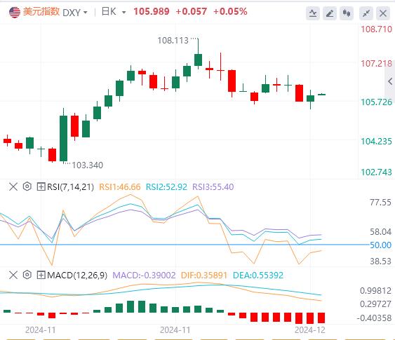 12月9日,北京时间周一亚市早盘,美元指数徘徊在105.98附近。上周五,美元指数先跌后涨,其在美盘前一度跌至105.39的日内低点,而后快速反弹,并一度重回106关口上方,但未能站稳此处,最终收涨0.23%,报105.94。美债收益率有所下行,两年期美债收益率收报4.112%,10年期美债收益率收报4.17%。因美国11月就业报告显示劳动力市场继续逐步松动,为美联储再次降息留下了空间。现货黄金上周五小幅上扬,并一度站上2640美元关口上方,最终收涨0.05%,报2633.01美元/盎司。现货白银最终收跌1.17%,报30.95美元/盎司。尽管欧佩克+决定推迟增产并将深度减产行动延长至2026年底,但市场似乎依旧担心明年需求疲软仍将导致供应过剩,两油上周五跌超1%,WTI原油日内持续下挫,最终收跌1.74%,报66.96美元/桶;布伦特原油收跌1.52%,报70.89美元/桶。