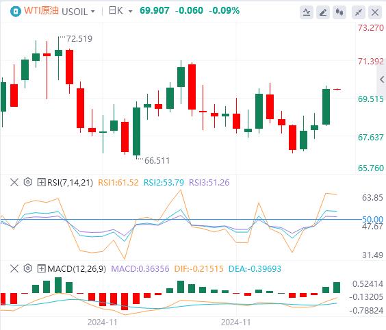 12月12日,北京时间周四亚市早盘,美元指数徘徊在106.54附近。周三,美元指数稳站106关口上方,最终收涨0.23%,报106.65。美债收益率持续上行,两年期美债收益率收报4.157%,10年期美债收益率收报4.275%。因美国11月CPI数据符合预期,增加了美联储下周降息的可能性,现货黄金盘中一度冲上2720美元,最终收涨0.89%,报2717.44美元/盎司。现货白银收涨0.02%,报31.89美元/盎司。另外,金银于亚盘时段出现较大的期现价差,金融机构认为市场流动性问题是“罪魁祸首”。因欧盟同意对俄罗斯石油出口实施新一轮制裁,这可能会使全球原油供应趋紧,两油涨超2%,WTI原油大幅上涨,盘中一度站上70美元关口上方,最终收涨2.62%,报69.96美元/桶;布伦特原油收涨2.07%,报73.36美元/桶。
