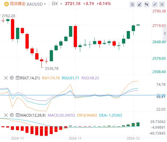周四亚盘,黄金交投于2721.18附近。在美国(US)通胀数据发布后,金价周三延续了上涨趋势。随着通货紧缩进程的发展,对美联储(Fed)下周降息的预期再次得到证实,但速度较慢。美国劳工统计局(BLS)显示,美国11月消费者价格指数(CPI)保持坚挺,总体和核心数据与经济学家的月度和年度估计一致。